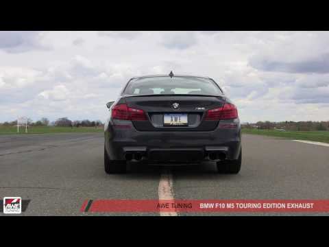 The AWE Tuning BMW F10 M5 Touring Edition Exhaust includes the exhaust system itself, exhaust tips (four), and all clamps and hardware required for installation. The AWE Tuning BMW F10 M5 Exhaust Suite is available in two tip color choices, our signature Chrome silver, or Diamond Black. All tips for the M5 are 102mm, filling the rear valence for more muscular styling.