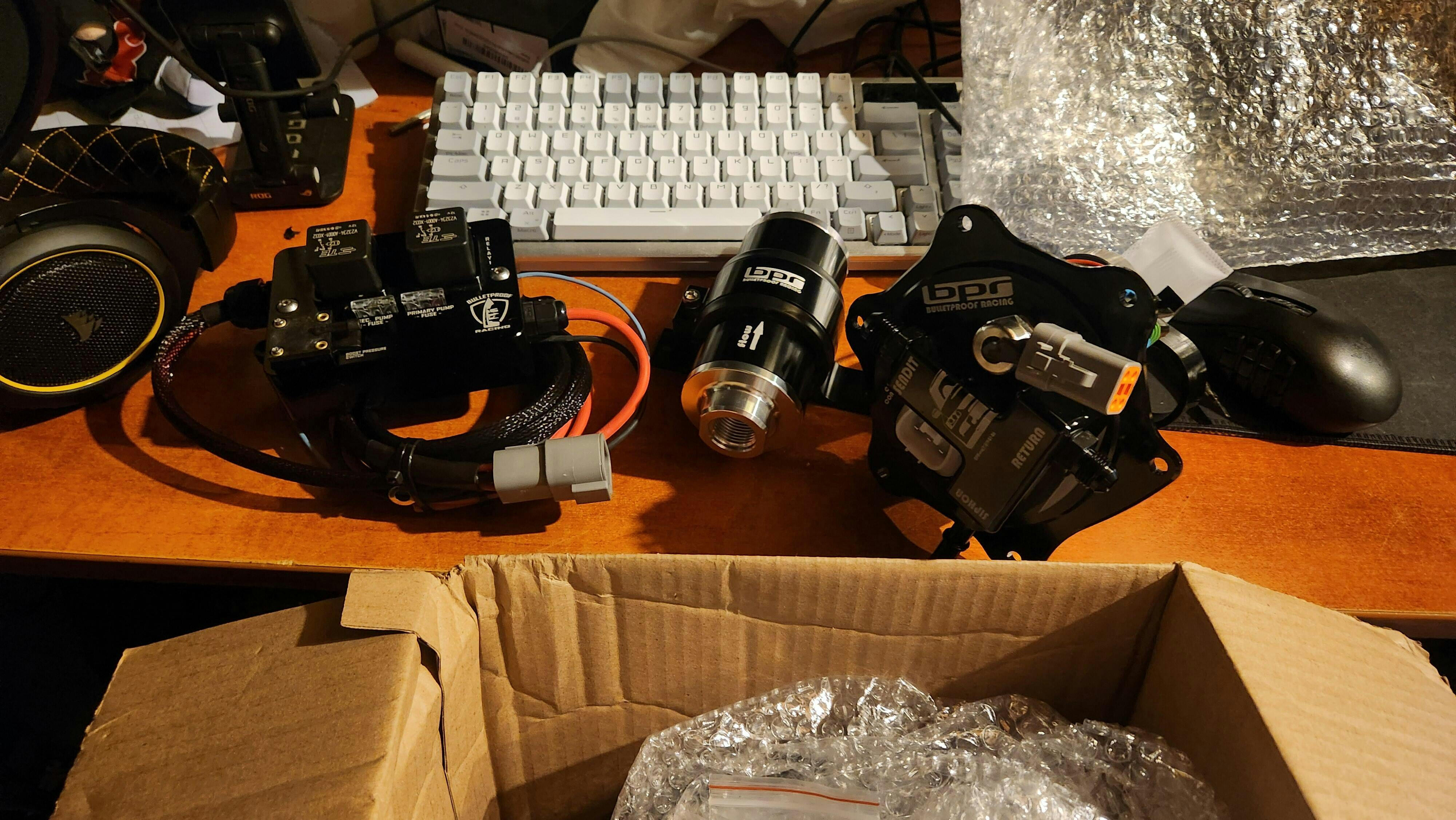 The fuel level sending unit (not included) stays in the same spot as the stock housing. A Deutsch mil-spec connector for the pumps to connect to the relay box. Mil-spec wiring harness. Billet relay box 2 TICO relays adjustable boost pressure switch and battery cable.