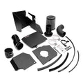 The airbox is constructed of black powder-coated aluminum. A slot in the front of the airbox accepts air directed through the factory air scoop. Air is filtered through a larger pre-oiled filter and routed to the velocity stack MAF housing. The wire-reinforced black silicone couplers are sealed on either end with clamps for a leak-free installation.