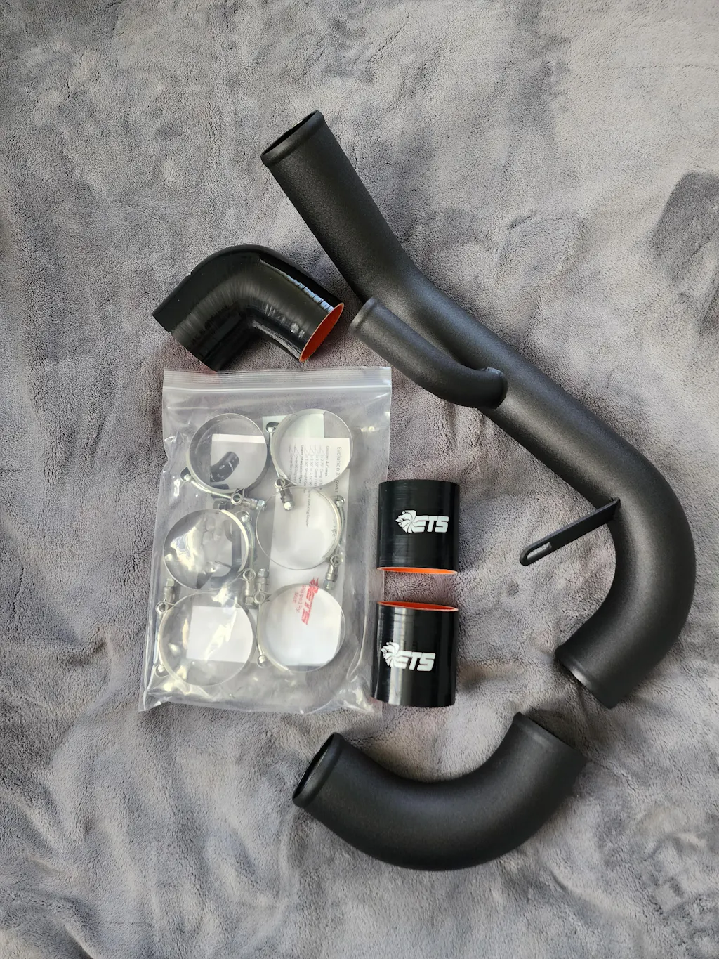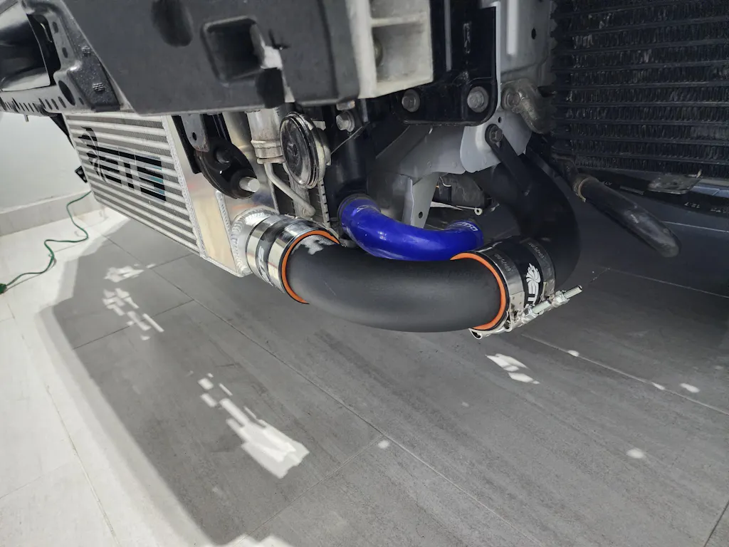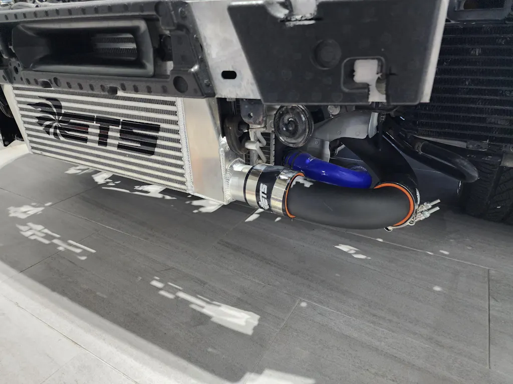 From the intercooler outlet the 2.5" mandrel bent piping continues around the core support, with only two gradual radius bends in its entire length, to the lower intercooler pipe bracket before making a straight shot to the throttle body. ETS 4-ply silicone and 100% SS T-bolt clamps are included for every connection to ensure that blown off intercooler piping stays a thing of the past.