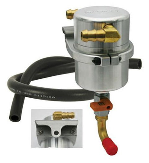 - Includes stainless steel mounting brackets, inlet and outlet fittings and rubber hose for plumbing the Air-Oil Separators inline and billet aluminum mounting clamps for the body of the Separator