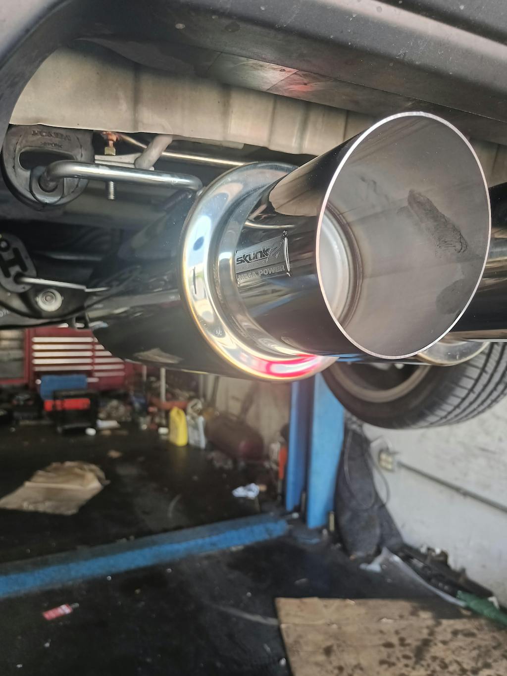 All MegaPower exhaust systems are finely tuned using CNC Mandrel bends, precision robotic TIG-welds and unrestrictive resonators to maximize exhaust velocity and eliminate restriction. Featuring parallel, dual race mufflers mounted center beneath the bumper, this system emits that iconic, vicious Skunk2 exhaust note.