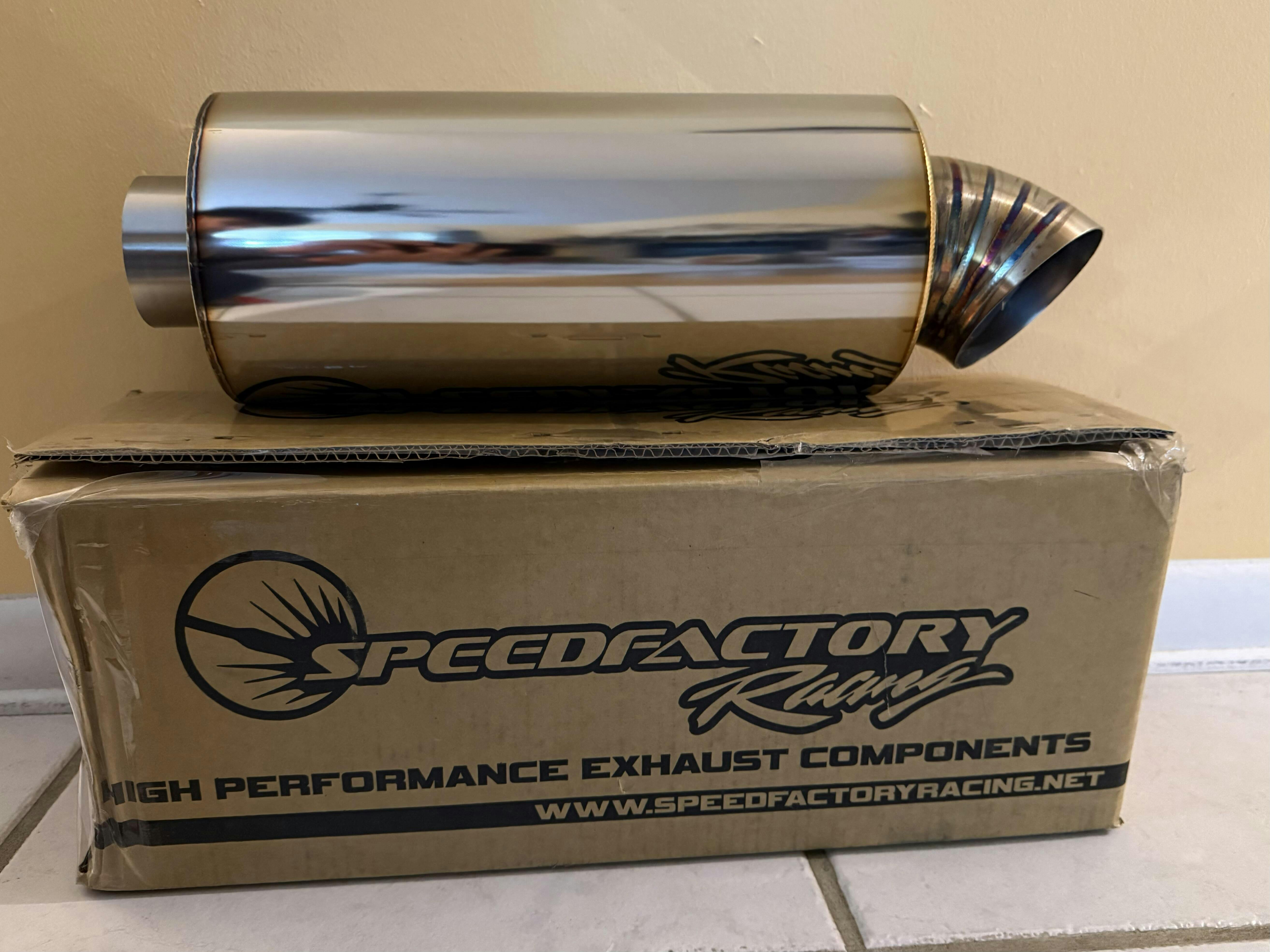 Construction consists of high-quality polished T304 stainless steel with a beautifully TIG welded & back purged body and exhaust tip. Premium multi-layer high temp packing ensures long-lasting performance and a 6.0” diameter round body offers good sound suppression & fitment flexibility. The SpeedFactory logo is laser engraved onto the tip.