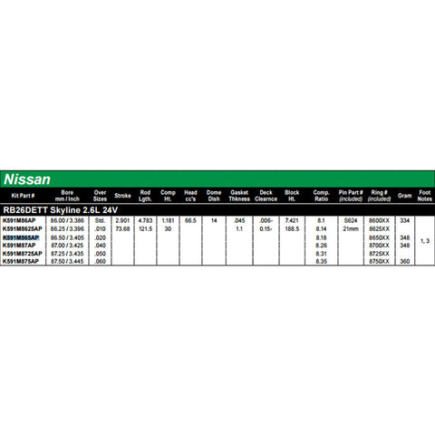 Bulding a motor for your 1989-2002 Nissan Skyline RB26DETT? Wiseco is proven to make some of the best pistons on the market! Featuring valve pocket designs that allow maximum flow around valve, also allowing oversized valves ang high lift cams to be utilized and piston crown shapes designed to promote maximum intake charge efficiency thru scavenging mixture "cross flow" during intake and exhaust valve overlap. More fuel and air equals more horsepower! Their pistons are designed to optimize squish or quench during compression combustion cycle event, resulting in resistance to detonation and pre-ignition. The end product is longer engine life and increased horsepower potential.