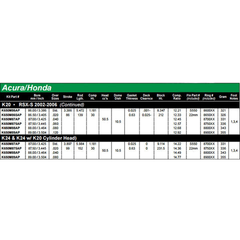 Have a K20, K24 or K24 w/ K20 Cylinder Head you're planning to build? Wiseco is proven to make some of the best pistons on the market! Featuring valve pocket designs that allow maximum flow around valve, also allowing oversized valves ang high lift cams to be utilized and piston crown shapes designed to promote maximum intake charge efficiency thru scavenging mixture "cross flow" during intake and exhaust valve overlap. More fuel and air equals more horsepower! Their pistons are designed to optimize squish or quench during compression combustion cycle event, resulting in resistance to detonation and pre-ignition. The end product is longer engine life and increased horsepower potential.
