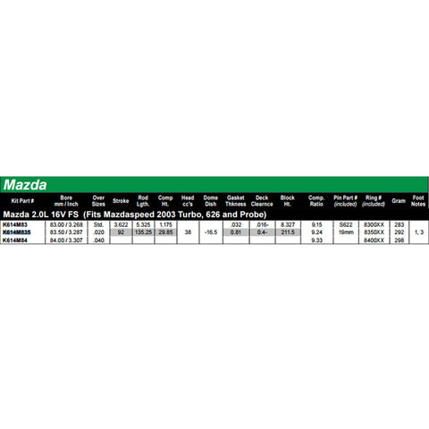 Own a 2003 Mazdaspeed Protege, 1993-2002 Mazda 626 or 1993-1997 Ford Probe and plan on building a motor? Wiseco is proven to make some of the best pistons on the market! Featuring valve pocket designs that allow maximum flow around valve, also allowing oversized valves ang high lift cams to be utilized and piston crown shapes designed to promote maximum intake charge efficiency thru scavenging mixture "cross flow" during intake and exhaust valve overlap. More fuel and air equals more horsepower! Their pistons are designed to optimize squish or quench during compression combustion cycle event, resulting in resistance to detonation and pre-ignition. The end product is longer engine life and increased horsepower potential.